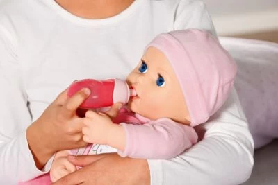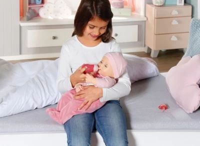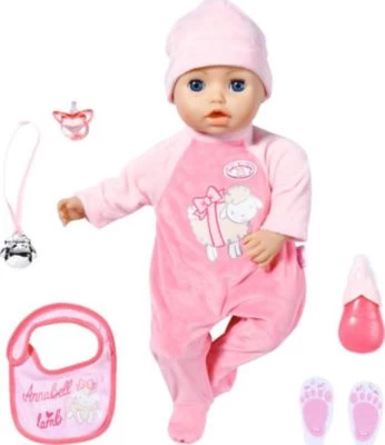 Annabell mit dem weichen Körper, begleitet kleine Puppen-Mamas und -Papas mit lebensechten Funktionen durch den Tag. Baby Annabell Annabell 43 cm von Zapf Creation Baby Annabell Markenspielpuppe mit lebensechten Funktionen inkl. Strampelanzug, Mütze, Latz, Flasche, Schnuller und Kette reagiert auf Berührung und Bewegung ab 3 Jahren geeignet Am Morgen, gleich nach dem Aufwachen trinkt sie am liebsten Wasser aus der Flasche. Beim Nuckeln bewegt sie ihren Mund und genießt das Frühstück hörbar. Nach dem Trinken noch ein Bäuerchen und schon kann gespielt werden. Annabell lacht begeistert, wenn man mit ihr Hoppe-Hoppe-Reiter spielt. Die Kleine ist auch super kitzelig. Sie kichert fröhlich, wenn man sie am Bauch kitzelt. Manchmal rutscht ihr dabei sogar ein kleiner Pups heraus. „Ups! – Kicher!“ Auch das fröhlichste Puppenkind hat mal schlechte Laune. Dann schluchzt Annabell und weint echte Puppentränen. Sie lässt sich aber schnell wieder durch alle möglichen Aktivitäten beruhigen. Hoch im Kurs steht der Schnuller, an dem sie mit Mundbewegungen und Geräuschen nuckelt. Zur Gute-Nacht-Zeit wird sie vorwärts, rückwärts, seitwärts in den Schlaf geschaukelt. Dabei gähnt sie ausgiebig, schließt die Schlafaugen und schlummert mit tiefen Atemzügen. Hinweis Batterien (3 x AA Mignon) sind nicht im Lieferumfang enthalten. Bitte separat bestellen.