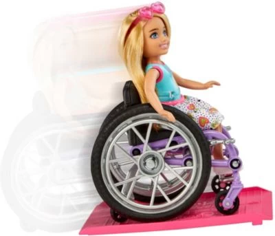 Barbies Schwester Chelsea ist ein besonders neugieriges Mädchen. In ihrem Rollstuhl erkundet sie gerne die Welt, macht Ausflüge und möchte immer ganz viel erleben. Mit der im Set enthaltenen Rampe können Kids sie dabei unterstützen und die Umgebung barrierefreier gestalten. Für den schicken Look können Rollstuhl und Rampe zusätzlich mit Stickern beklebt werden.
