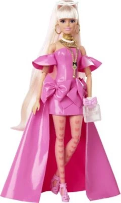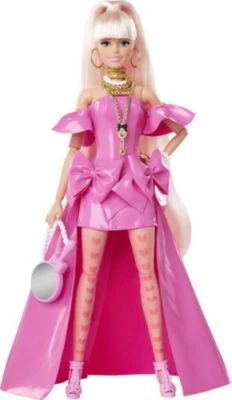 Mit ihrem außergewöhnliche Abenddress mit bodenlangem Rock und zwei extravaganten Schleifen. natürlich trägt sie auch die passenden Accessoires dazu. Dank mehrer Bewegungspunkte ist sie sehr agil und kann gemeinsam mit ihrem coolen pudel einen ganz besonderen Spaziergang unternehmen und damit der Farbe Pink Tribut zollen.
