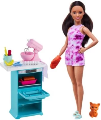Barbie liebt Mode und Backen! Mit dem Barbie-Puppe und Küchen-Spielset mit Haustier und Zubehör von Mattel können kleine Barbie-Fans tolle Backkunstwerke kreieren, eigene Geschichten erfinden und Alltagsabenteuer nacherzählen. Barbie trägt zuhause gerne ihren praktischen und farbenfrohen Jumpsuit und hat sich die Haare zu Zöpfen gestylt. In Begleitung ihrer kleinen Katze liebt sie es in der Küche Köstlichkeiten zu kochen und zu backen. Mit in dem Set enthalten ist ein Ofen mit Arbeitsplatte, eine Küchenmaschine mit Rührgerät, das sich sogar bei Knopfdruck dreht und ganz viele weitere Koch- und Backzubehörteile. Wenn Barbie das heiße Blech aus dem Ofen nimmt, zieht sie sich ihren Ofenhandschuh über, damit sie sich nicht die Finger verbrennt. Hmm – wie das duftet! Kreativer Spielespaß und immer wieder neue Geschichten sind mit diesem umfassenden Spieleset garantiert.