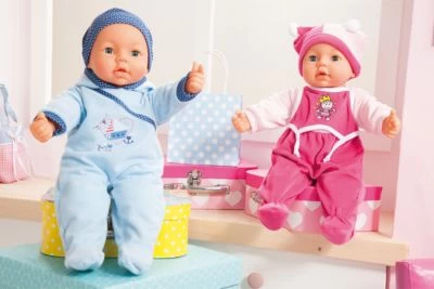 Die niedliche Hello Baby Puppe lädt zum Spielen, Schmusen und Umsorgen ein. Erhält der putzige Kerl sein Fläschchen, fängt er fröhlich an zu schmatzen und bewegt sein kleines Mündchen. Ist es Zeit fürs Bett, kann er sanft in den Schlaf gewogen werden, bis er die Augen schließt und grinst. Kitzelt man seinen Bauch, lacht er laut auf. Hello Baby Boy bringt einen wunderschönen Strampelanzug in Himmelblau mit, der niedliche Applikationen trägt. Passend dazu trägt der süße Fratz ein Mützchen, das seinen Kopf schön warm hält.