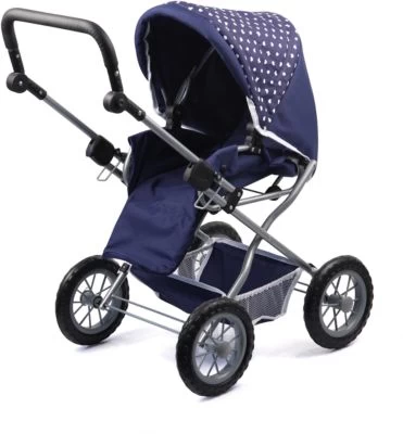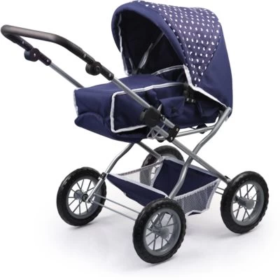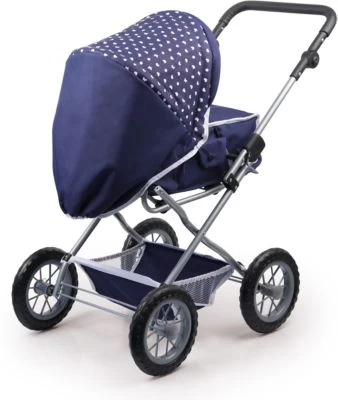 Dieser Kombi-Puppenwagen Grande in modernem Design wird mit herausnehmbarer Tragetasche geliefert. Entnimmt man die Tragetasche, kann die ca. 38 – 46 cm Puppe im Handumdrehen in einem Sportwagen sitzen. Auf Grund seiner verstellbaren Griffhöhe ist er auch schon für die kleinsten Puppenmuttis geeignet. Zum leichten Transport kann der Puppenwagen ganz einfach zusammengeklappt werden. In der Puppenwagentasche und dem Einkaufskorb kann alles mitgenommen werden, was die Puppenmutti und ihr Liebling für den Ausflug brauchen. Das Set enthält außerdem ein Reisebett für Puppen, eine Flasche für Puppen, einen Tragegurt, Schnuller, Plastikgeschirr, sowie Fläschchen für Pflegemittel.