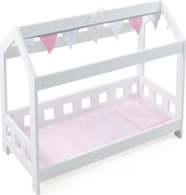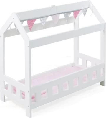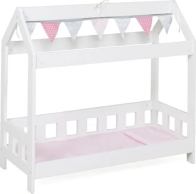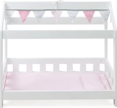 Das moderne Puppen-Kabinenbett von CHIC 2000 ist ein echter Hingucker in der Spielecke. Das Holzpuppenbett überzeugt durch eine ausgefallene Konstruktion mit einer umrahmten Liegefläche und einem offenen Spitzdach an dem Fähnchen in rosa und grau befestigt sind. Schöne Puppenträume sind garantiert! Besonders toll für die Puppeneltern: Hier finden auch größere Puppen bis zu einer Länge von 54 cm genügend Platz. Eine Bettdecke und ein Kopfkissen sind im Lieferumfang enthalten.