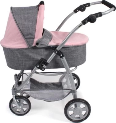 Der topmodische Kombi-Puppenwagen 3 in 1 „Emotion All in“ von CHIC 2000 gleicht den modernen Kinderwagen bis ins letzte Detail und wird so garantiert für viel Spielspaß sorgen! Der trendige Vierräder überzeugt mit seiner 3 in 1 Verwendungsmöglichkeit als Puppenwagen, Sportwagen, herausnehmbarer Wanne sowie einem separatem Autositz. Der Sportwagen ist mit einem 3-Punkt-Sicherheitsgurt ausgestattet und kann sowohl in Fahrtrichtung wie auch mit Blick zu den Puppeneltern verwendet werden. Die Winddecke der Babywanne dient gleichzeitig als Beindecke für den Sportsitz. Kurven fahren wird zum Kinderspiel aufgrund der schwenkbaren Vorderräder. Der Sportsitz und die Babywanne können beidseitig aufgesteckt werden, sowohl in Fahrtrichtung als auch mit Blick zum spielenden Kind. Für noch leichteren Transport kann der Puppenwagen zudem im Handumdrehen zusammengeklappt und sehr stark komprimiert werden. In dem praktischen Gepäcknetz kann Puppenzubehör und Proviant für die Puppe und die Puppeneltern eingepackt werden. Jetzt kann der Spaziergang mit Puppe und Co. beginnen!