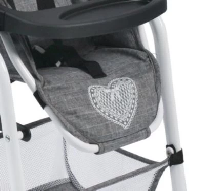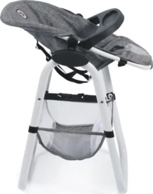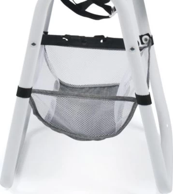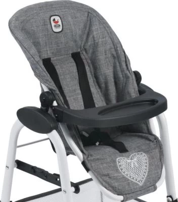 Großer, stabiler Puppen-Hochstuhl von CHIC 2000 mit abnehmbarem Tablett. Der Sitz kann bis in die Relax-Position verstellt werden. Er Sitz ist zudem abnehmbar und hat Tragegurte an der Rückseite, so dass er auch als Rückentrage verwendet werden kann. Unter dem Sitz ist ein großes Gepäcknetz, so dass die Puppeneltern genügend Platz für Ihr Zubehör haben. Der Puppenhochstuhl ist flach zusammenklappbar.
