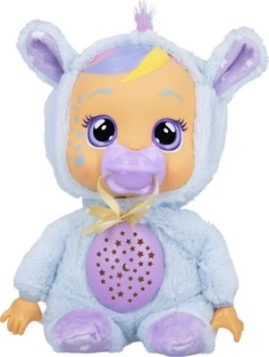 Hier kommt Jenna! Mit der Cry Babies „Schlaf schön Jenna“ von IMC Toys kommt eine kuschelweiche Spielebegleitung für den Tag und eine bezaubernde Einschlafhilfe für die Nacht. Wie die anderen Cry Babies weint auch Jenna Tränen, sobald man ihr den Schnuller wegnimmt. Aber Jennas Tränen leuchten im Dunklen! Und beim Druck auf ihr Puppenbäuchlein erscheint ein großer Sternenhimmel mit Mond an der Kinderzimmerdecke. Das Sternenbild leuchtet circa 11 Minuten lang und kann von 5 liebevollen Melodien, die sich jeweils für 30 – 45 Sekunden abspielen lassen, begleitet werden. Jenna hat aber auch 8 verschiedene Baby-Laute im Gepäck und ist im superweichen Schlafanzug einfach zum Liebhaben!