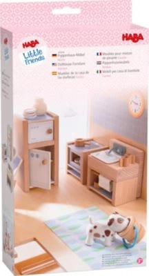 Die Küche ist die Seele eines Hauses. Die Puppenhaus-Möbel Küche aus der HABA-Serie Little Friends stellen den süßen Biegepuppen alles bereit, was sie zum Backen und Kochen brauchen: Ein Herd mit Backofen ermöglicht die Zubereitung vielfältiger Speisen und Backwaren, im Kühlschrank bleiben alle Lebensmittel frisch und unter der Spüle gibt es Stauram für Koch- und Backutensilien. Alle Möbel bestehen aus stabilen, bunt bedruckten Holzplatten und laden zu kreativen Rollenspielen ein. Kinder ab 3 Jahren haben am Little Friends-Puppenhaus-Möbel Küche lange Zeit ihren Spaß.