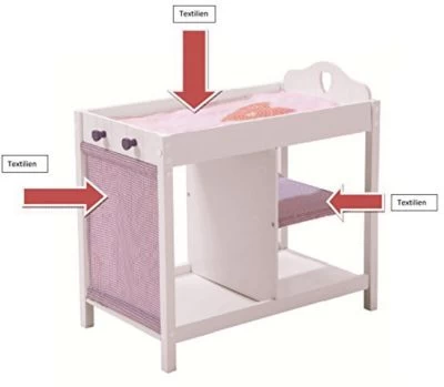 MDF weiß lackiert, mit Fräsungen im Landhausstil, Herzfräsung im Haupt, 1x wendbare Wickelauflage mit Herzmotiv bedruckt, Holz- und Stoffablage, mit Kleiderstange und 2 Garderobenhaken.
