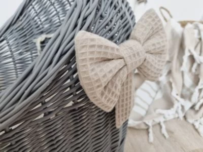 Farbe: Grau/Weiß, mit einem beige farbigen Bettwäscheset (Kissen und Decke) und Stoffschleife